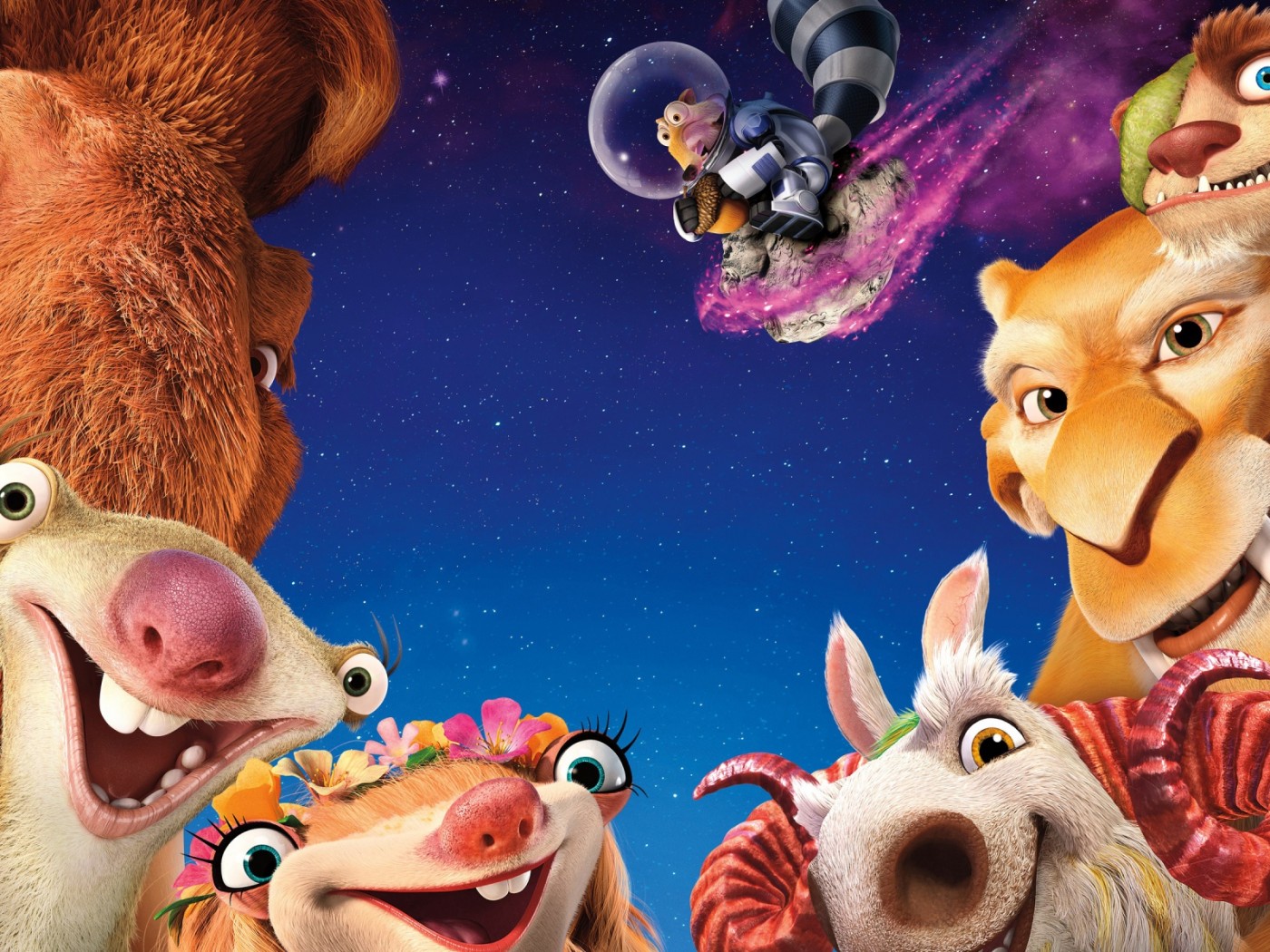 Ледниковый период, мультфильм, Мэнни, Сид, Диего, Элли, Крэш, Эдди, астероид, снег, ленивец, белка, космос, жолудь - 1400x1050