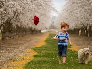 Веселый мальчик играет с собачкой весной обои дети - 320x240