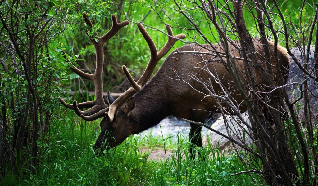 Взрослый олень в лесу - 1024x600
