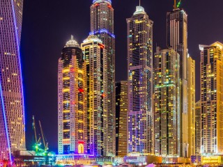 Дубай, город, небоскребы, здания, ночь, огни, красочный, яркий, городской пейзаж HD обои - 320x240