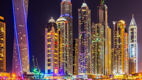 Дубай, город, небоскребы, здания, ночь, огни, красочный, яркий, городской пейзаж HD обои - 480x272 PSP