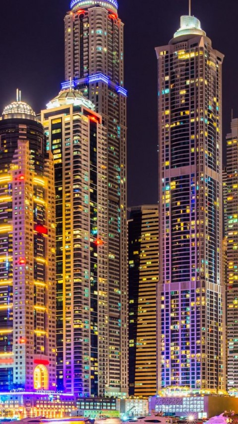 Дубай, город, небоскребы, здания, ночь, огни, красочный, яркий, городской пейзаж HD обои - 480x854