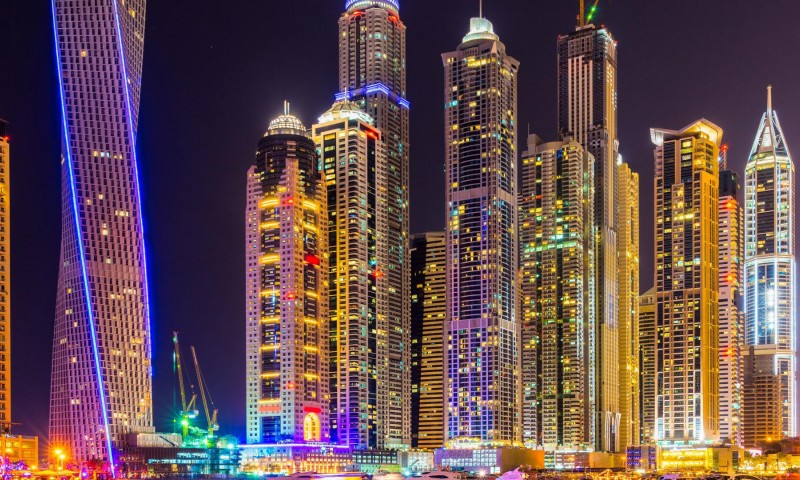 Дубай, город, небоскребы, здания, ночь, огни, красочный, яркий, городской пейзаж HD обои - 800x480