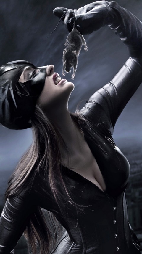 Женщина кошка, мышка, ночь, костюм, луна, еда - 480x854