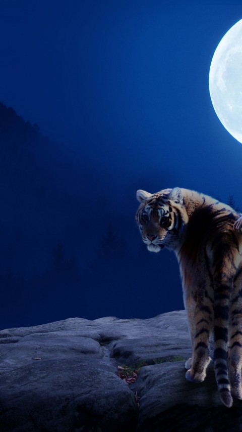 Красивая девушка с тигром под луной картинки 4K - 480x854