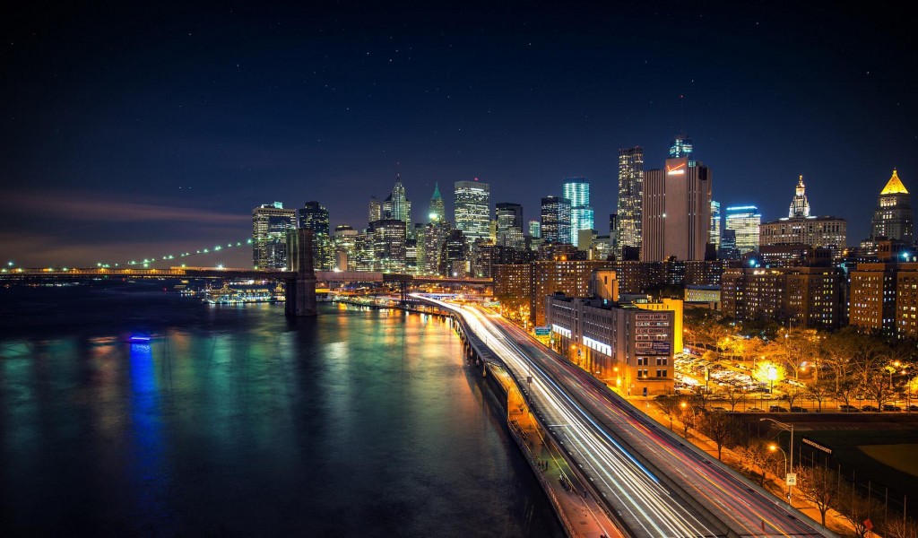 Манхэттен, мегаполис, ночной город, небоскребы, огни, обои, широкоформатные - 1024x600