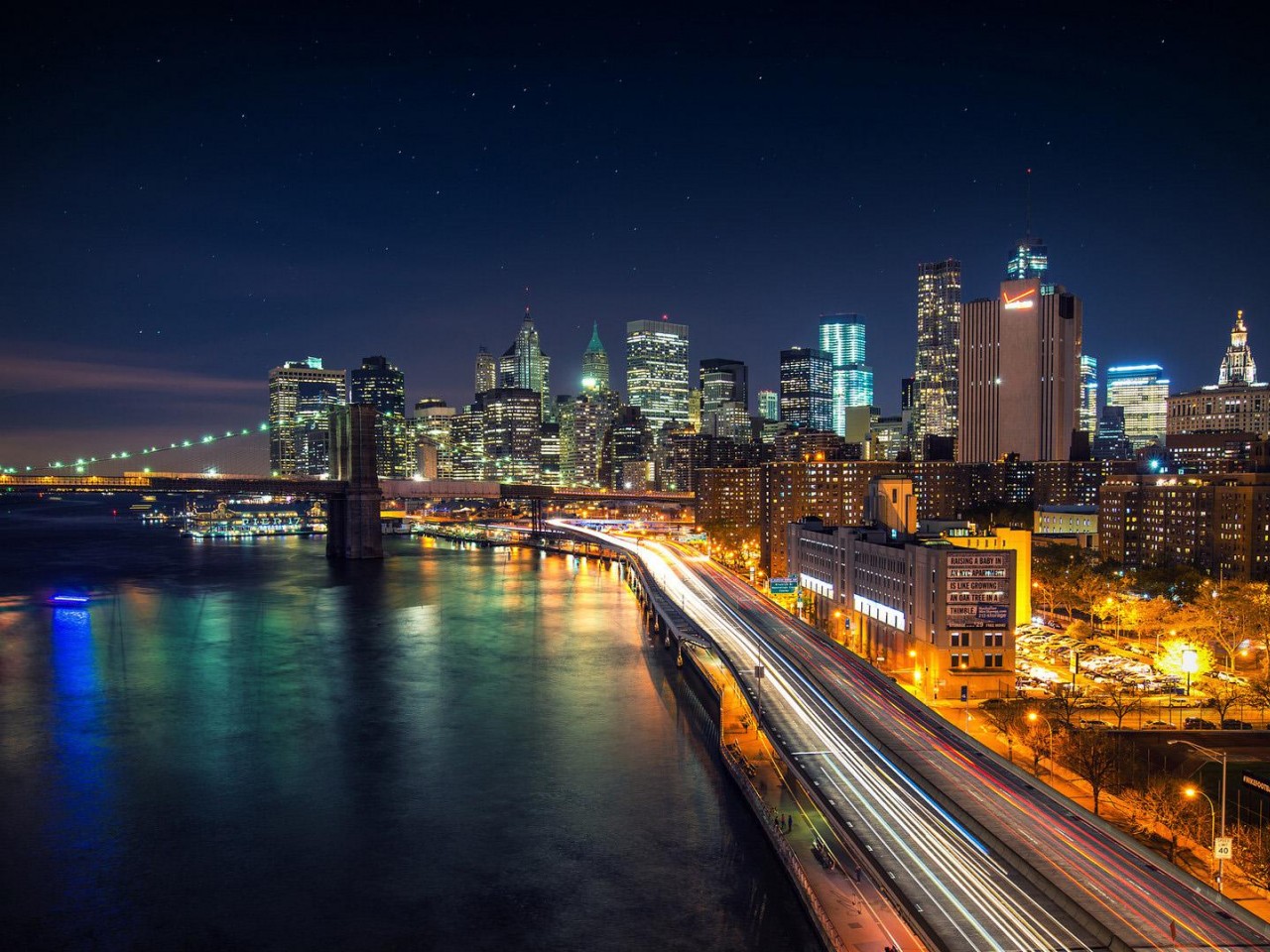 Манхэттен, мегаполис, ночной город, небоскребы, огни, обои, широкоформатные - 1280x960