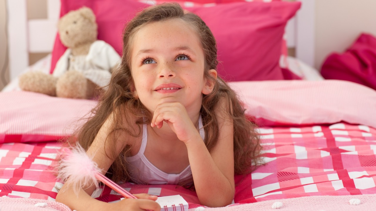Мечтательная девочка на кровати пишет в блокноте - 1280x720 (720p)