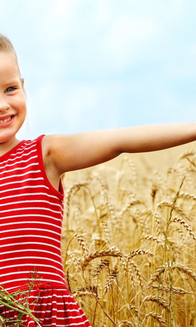 Милая маленькая девочка в пшеничном поле с букетом цветов - 768x1280