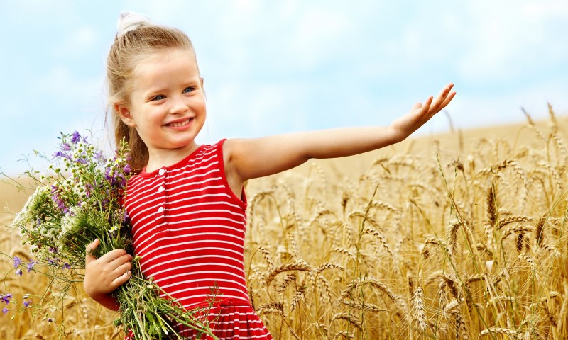 Милая маленькая девочка в пшеничном поле с букетом цветов - 800x480