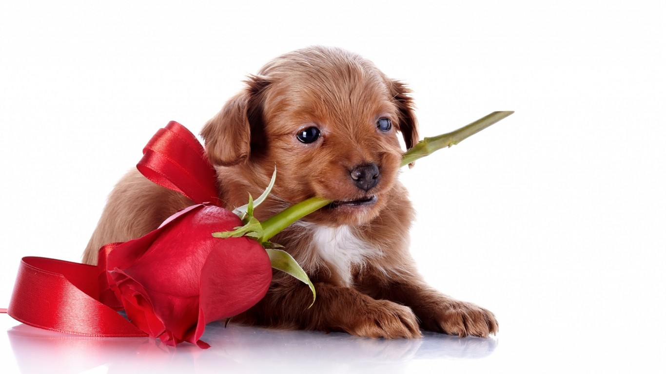 Милый щенок с красной розой в зубах к празднику обои - 1366x768