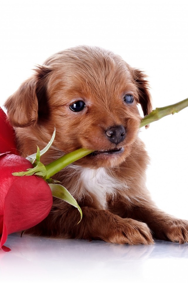 Милый щенок с красной розой в зубах к празднику обои - iPhone 4/4S/iPod