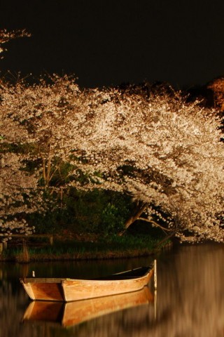Озеро, лодка, деревья вишни, башни, ночные огни, пейзаж, обои, картинки - Older iPhone & iPod
