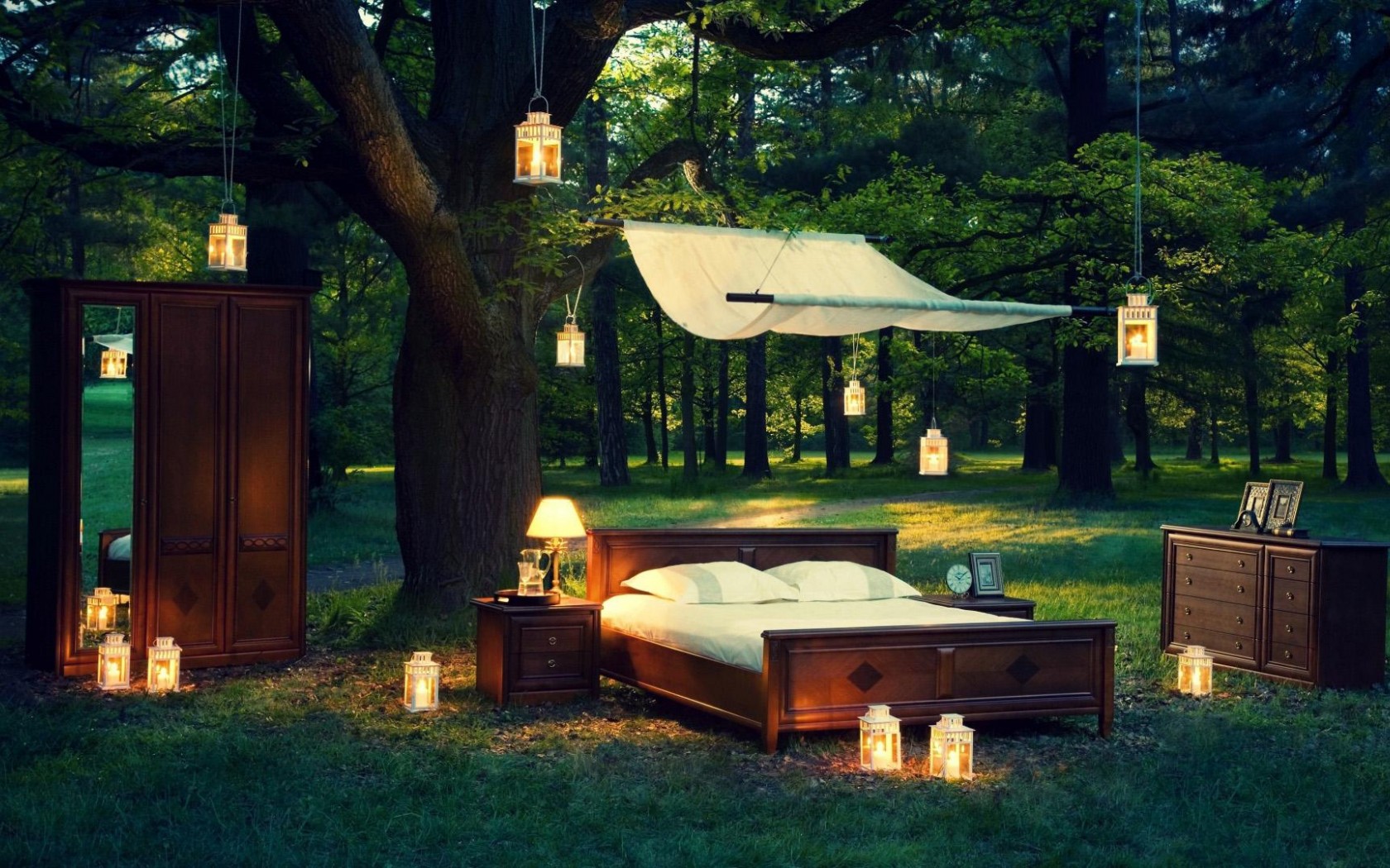Перемещение кровати, комната, шкаф, настольные лампы, люстры, природа, лес - 1680x1050