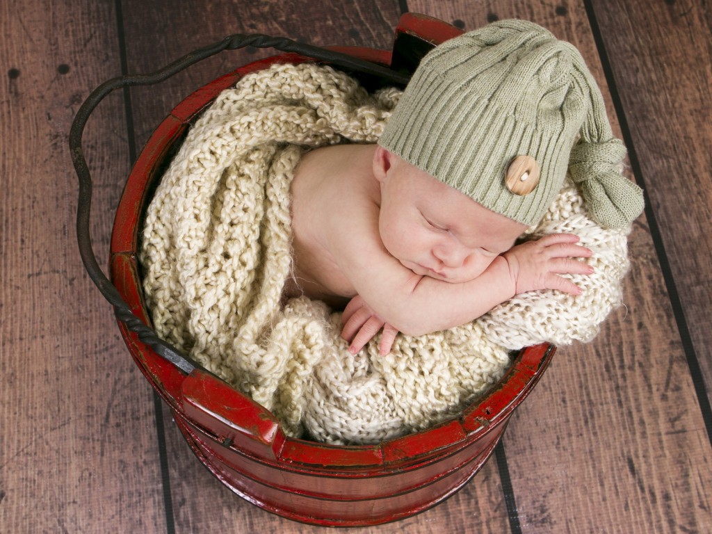Ребенок спит в кравсном ведре надувши щеки - 1024x768