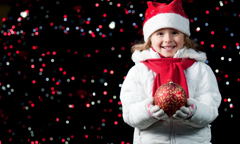 Улыбающаяся девочка с Новогодними игрушками - 800x480