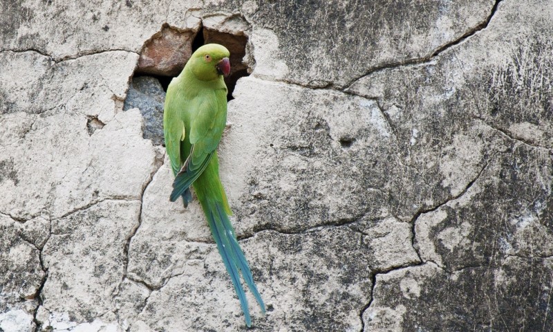 Фото попугая вида ожереловый Крамера сидящего на скале - 800x480