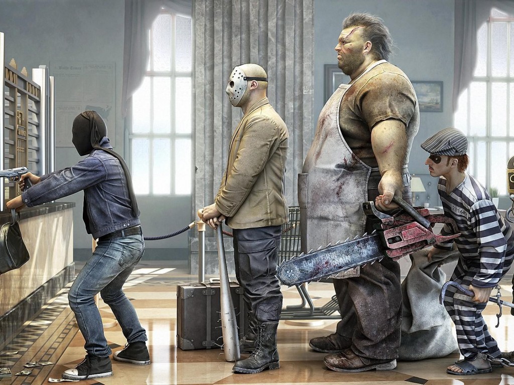 смешно грабители банка в ожидание ограбить стоят в очереди - 1024x768