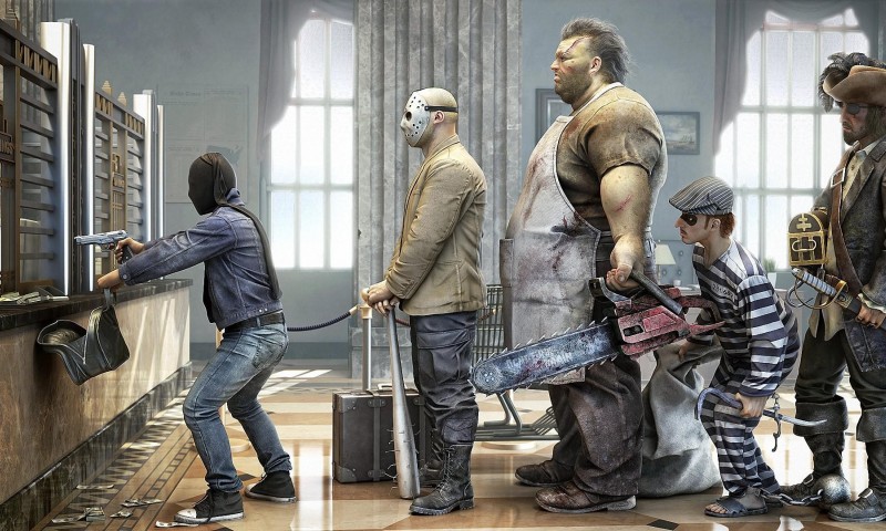 смешно грабители банка в ожидание ограбить стоят в очереди - 800x480