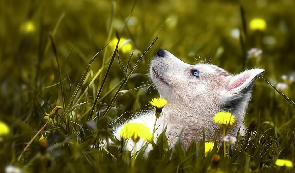 1920x1080, собака хаски, трава, цветок, настроения, изображения, голубые глаза, HD обои - 1024x600