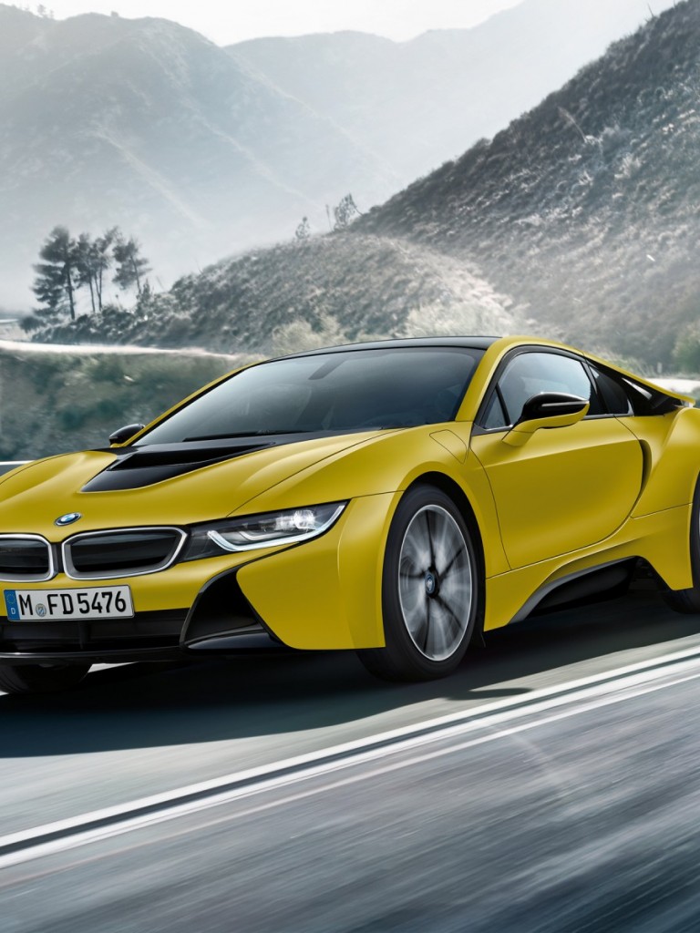2017 BMW i8 Frozen Yellow Edition на горной дороге обои HD - Non-retina iPad