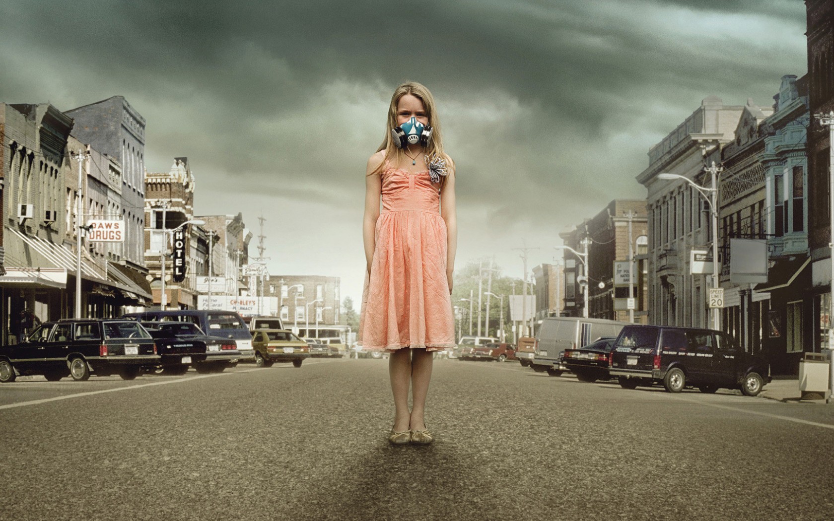 HD обои девочка в респираторе на фоне города - 1680x1050