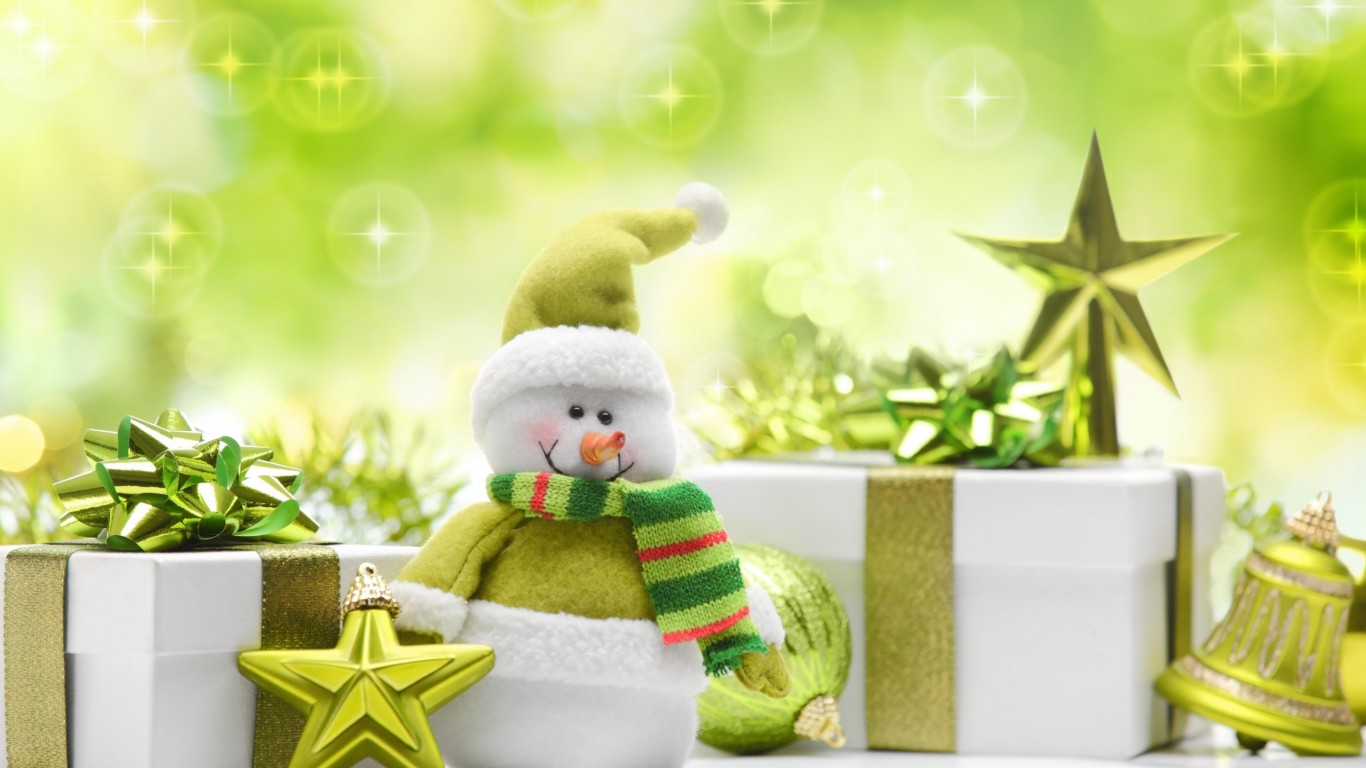 Веселые новогодний снеговик на зеленом фоне - 1366x768