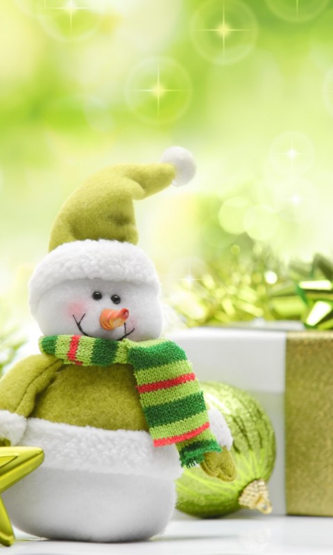 Веселые новогодний снеговик на зеленом фоне - 480x800