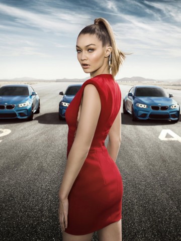 Девушка в красном платье Джиджи Хадид на фоне машин БМВ (BMW) - 360x480