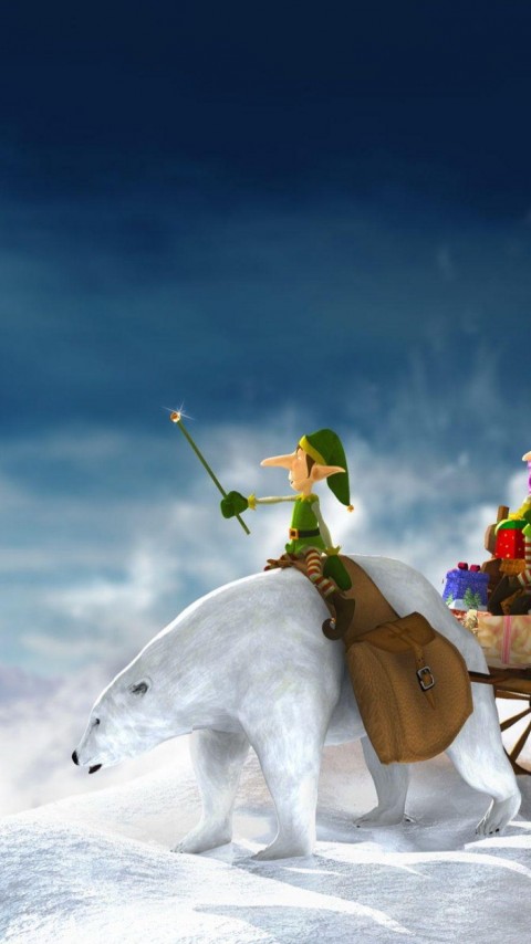 Зеленые эльфы везут воз подарков на белом медведе - 480x854