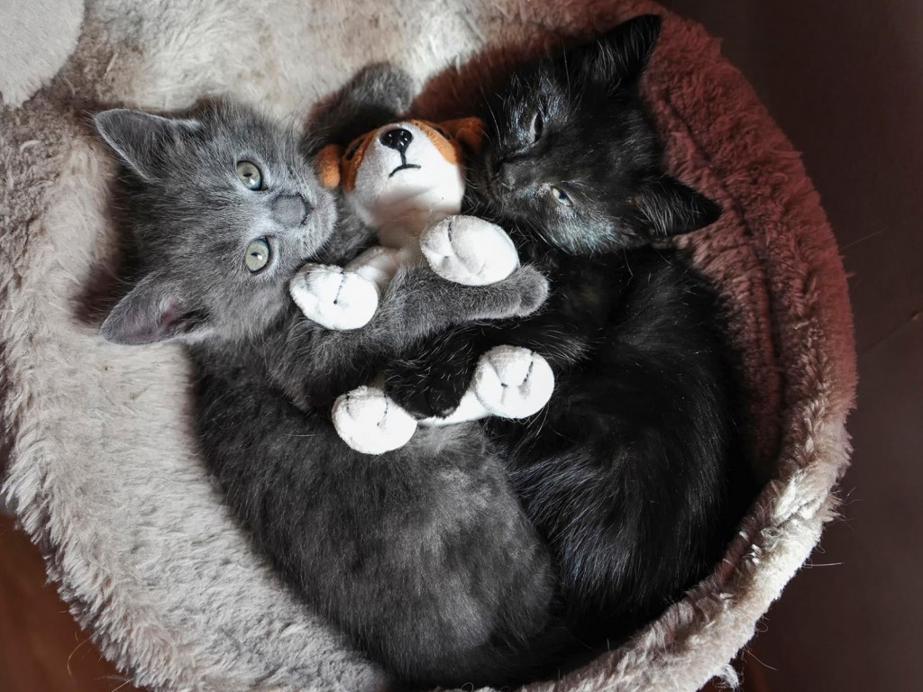 Котята, котики, игрушка, пушистики, дымчатый и черный кот фоны, заставки - 1024x768