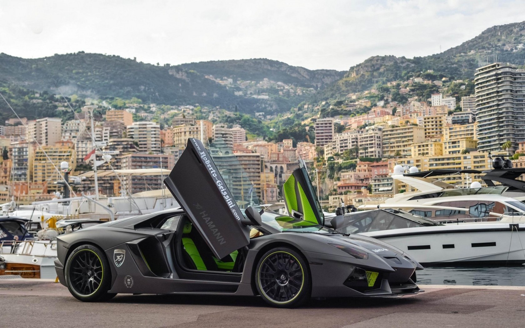Ламборджини серый Авентадор на пристани фоновые заставки - 1680x1050