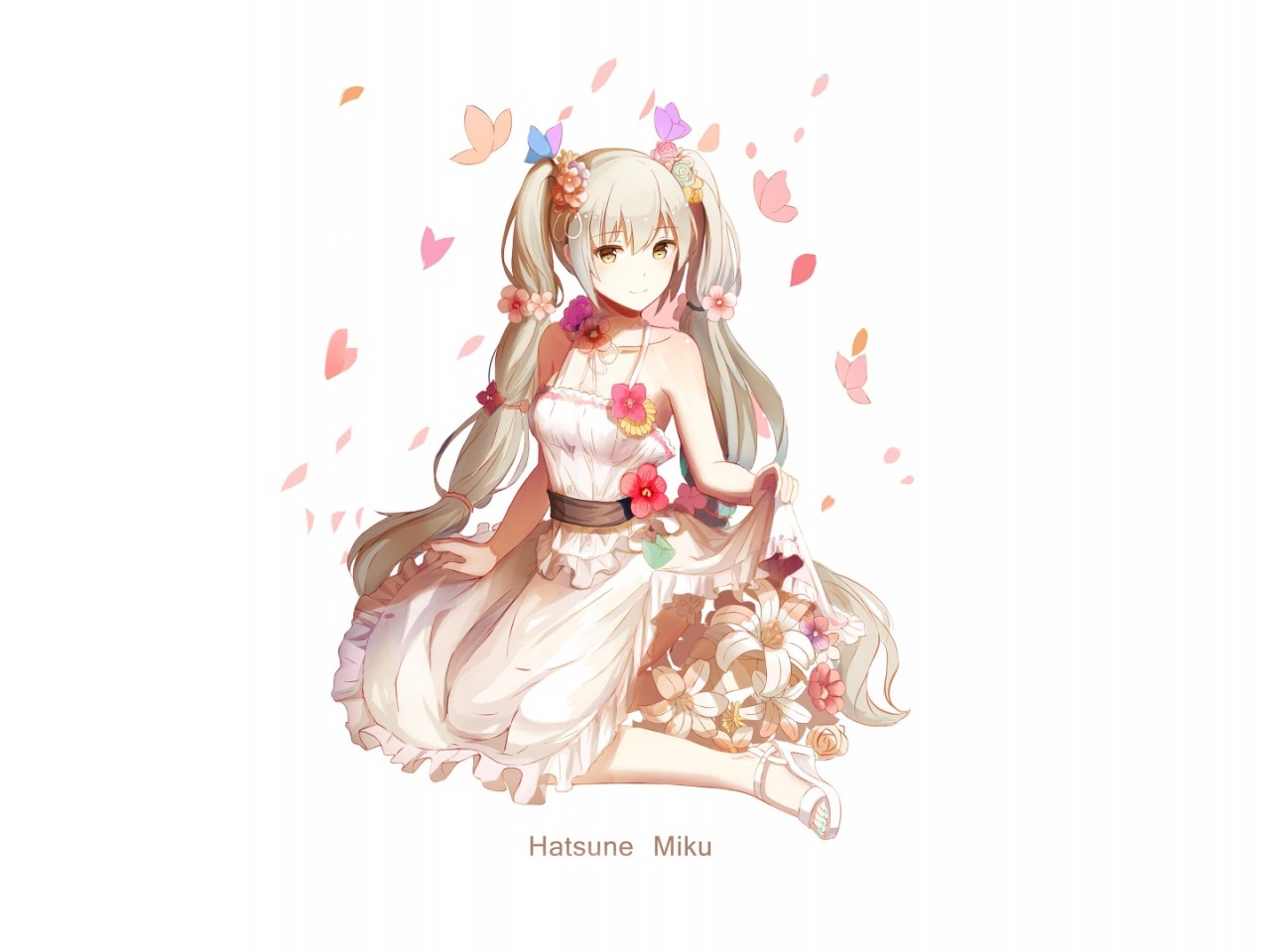 Мику Хацунэ, белый фон, платье, Мику Хацуне, певица, Vocaloid, hatsune miku, девушка, аниме обои - 1280x960