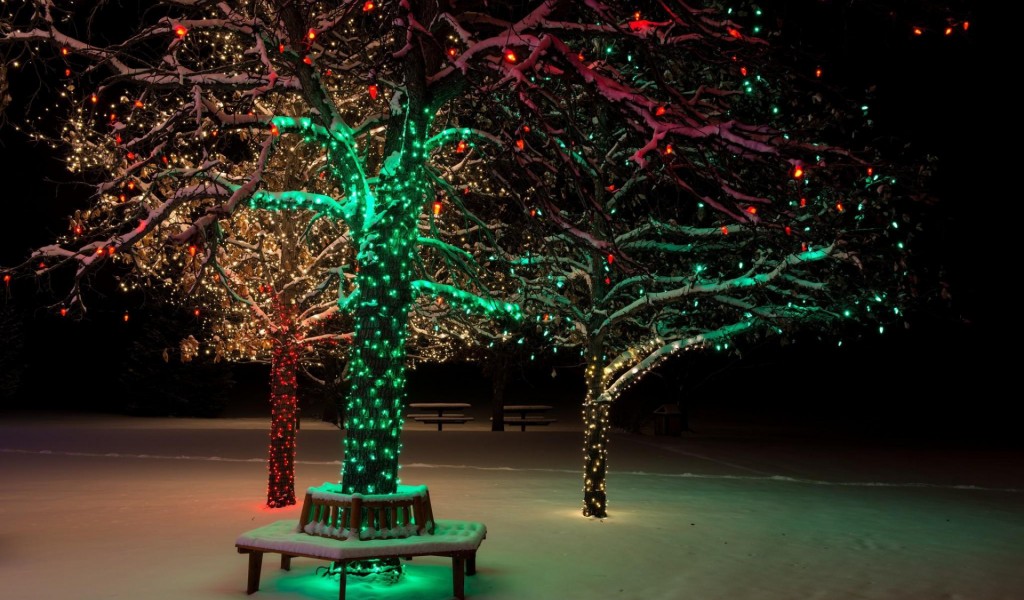 Новогоднее дерево, снег, зима, праздник, огни, фоны, заставки - 1024x600