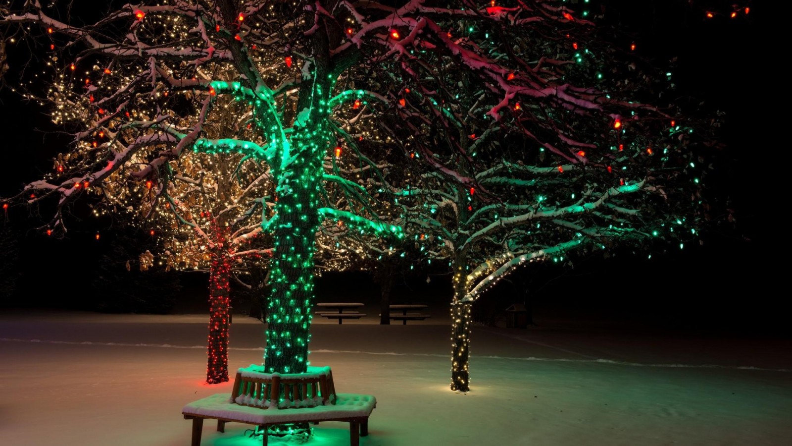 Новогоднее дерево, снег, зима, праздник, огни, фоны, заставки - 1600x900