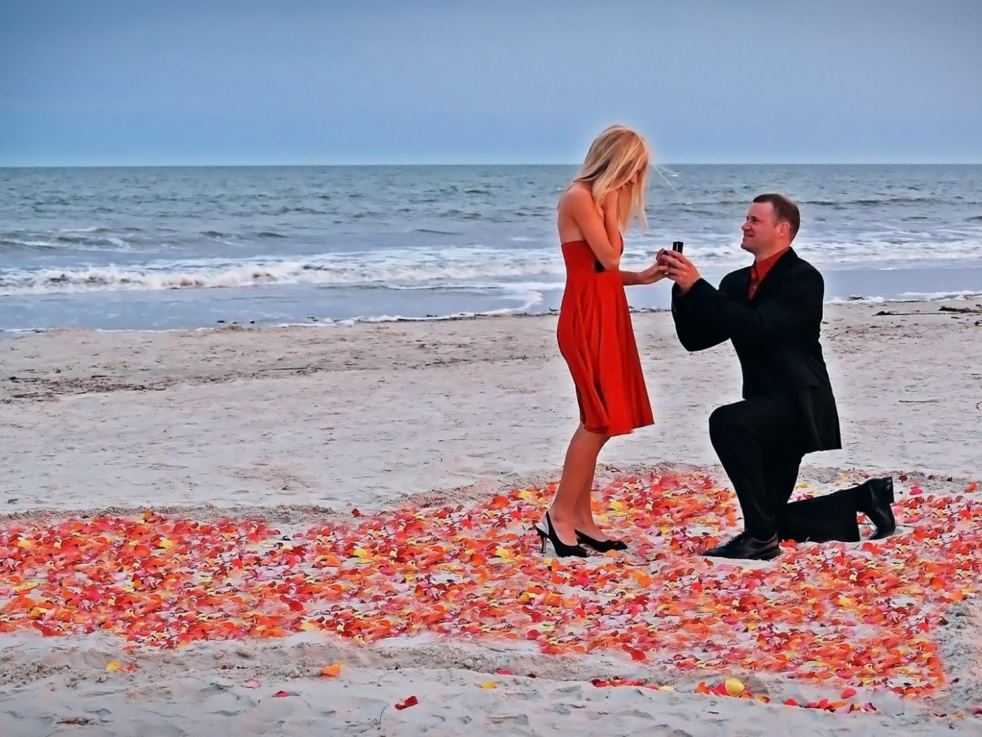Парень делает предложение на фоне моря, сердце на песке обои - 1400x1050