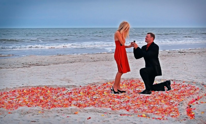 Парень делает предложение на фоне моря, сердце на песке обои - 800x480