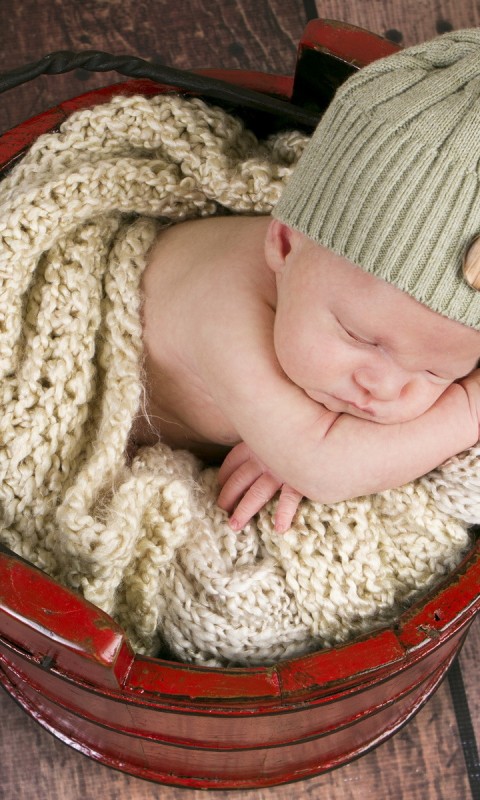Ребенок спит в кравсном ведре надувши щеки - 480x800