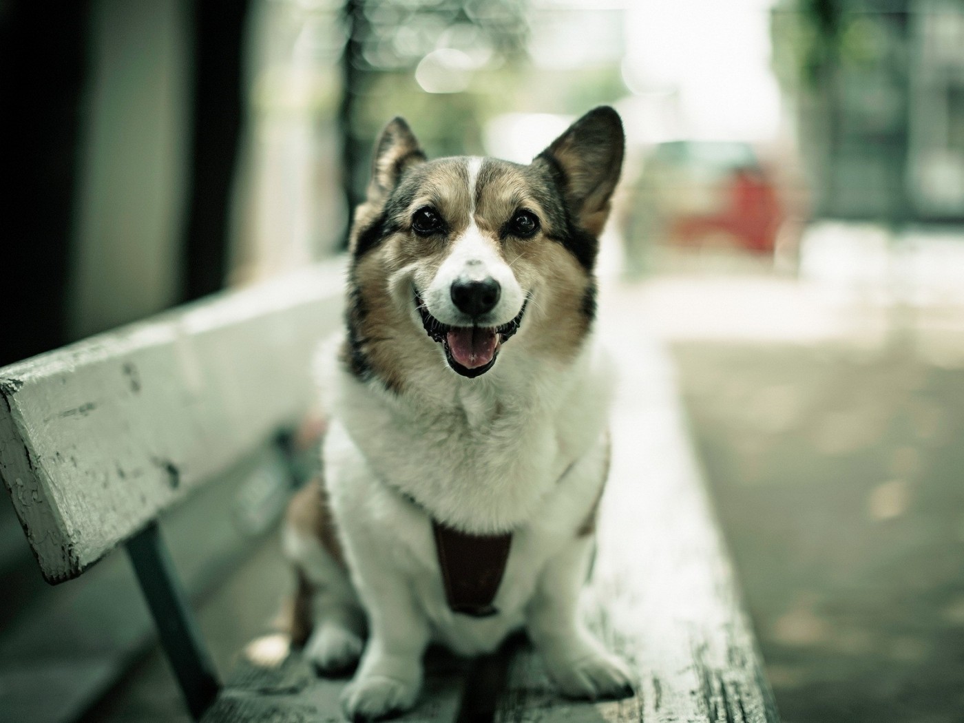 Собачка на лавочке в городе фоновые заставки скачать - 1400x1050