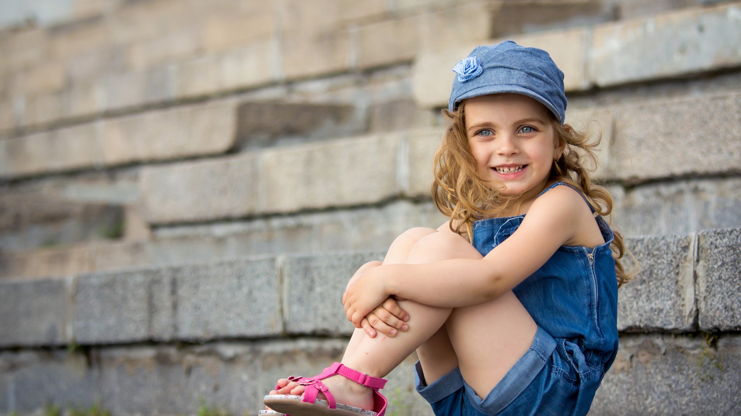 Улыбающаяся девочка на ступеньках обои скачать - 2560x1440