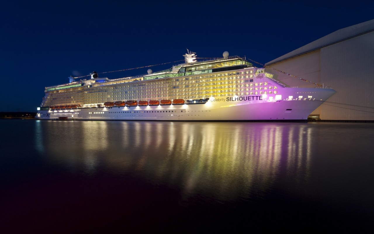 Фото огромного лайнера плывущего стоящего у пирса ночью - 1280x800