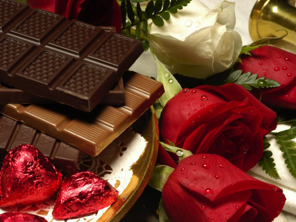 Шоколад, розовые сердечки, роза - 1024x768