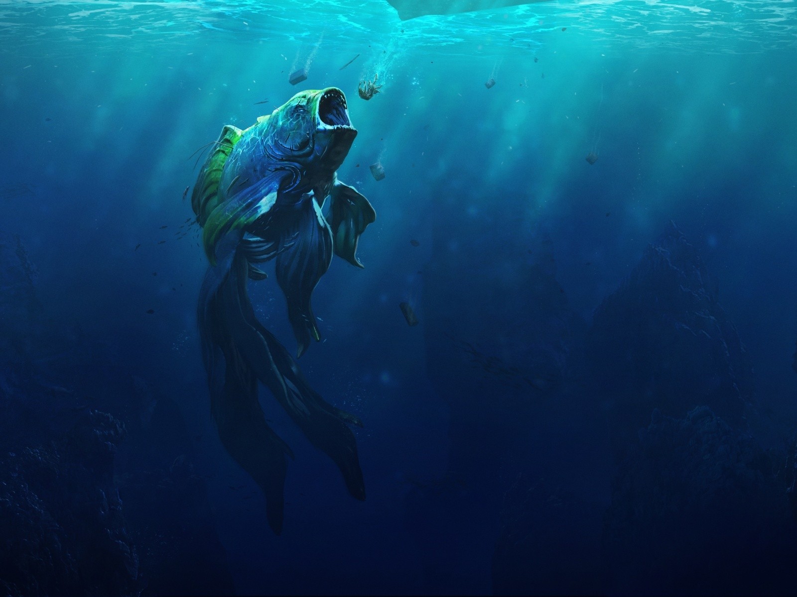 дикий монстр, золотая рыбка, подводный мир, фэнтези, рыба, обои - 1600x1200