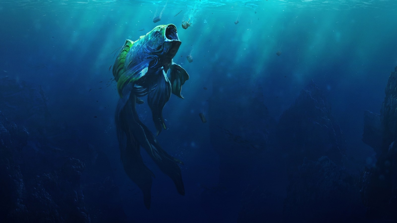дикий монстр, золотая рыбка, подводный мир, фэнтези, рыба, обои - 1600x900