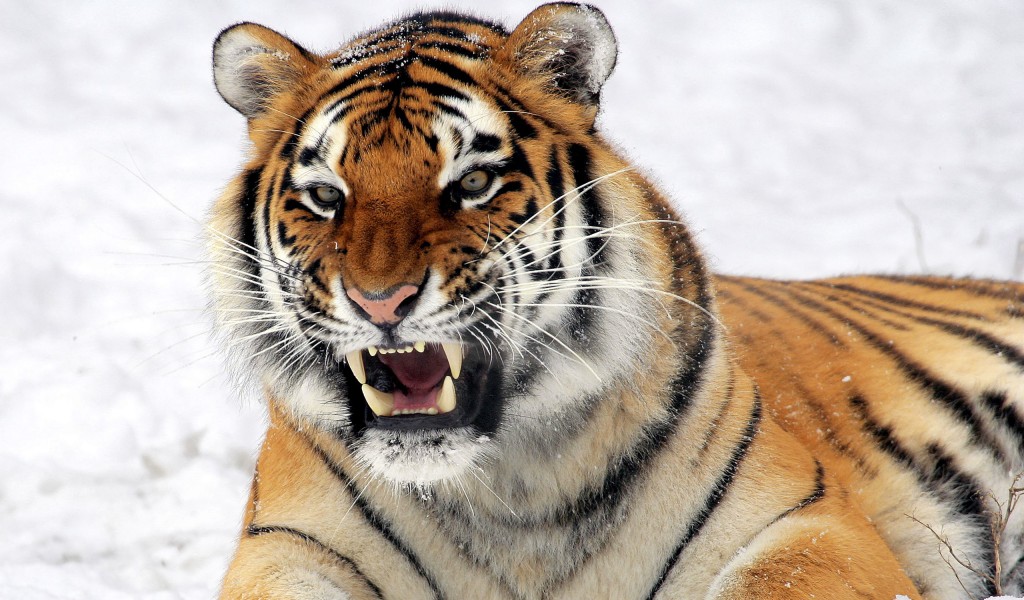 дикий тигр, хищник, клыки, снег, картинки - 1024x600