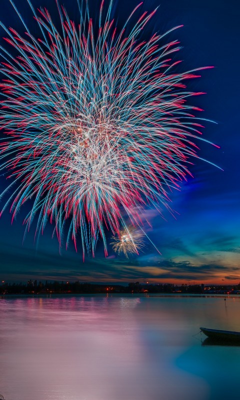 фейерверк, торжества, салют, ночь, море, набережная, праздник, вечер - 480x800