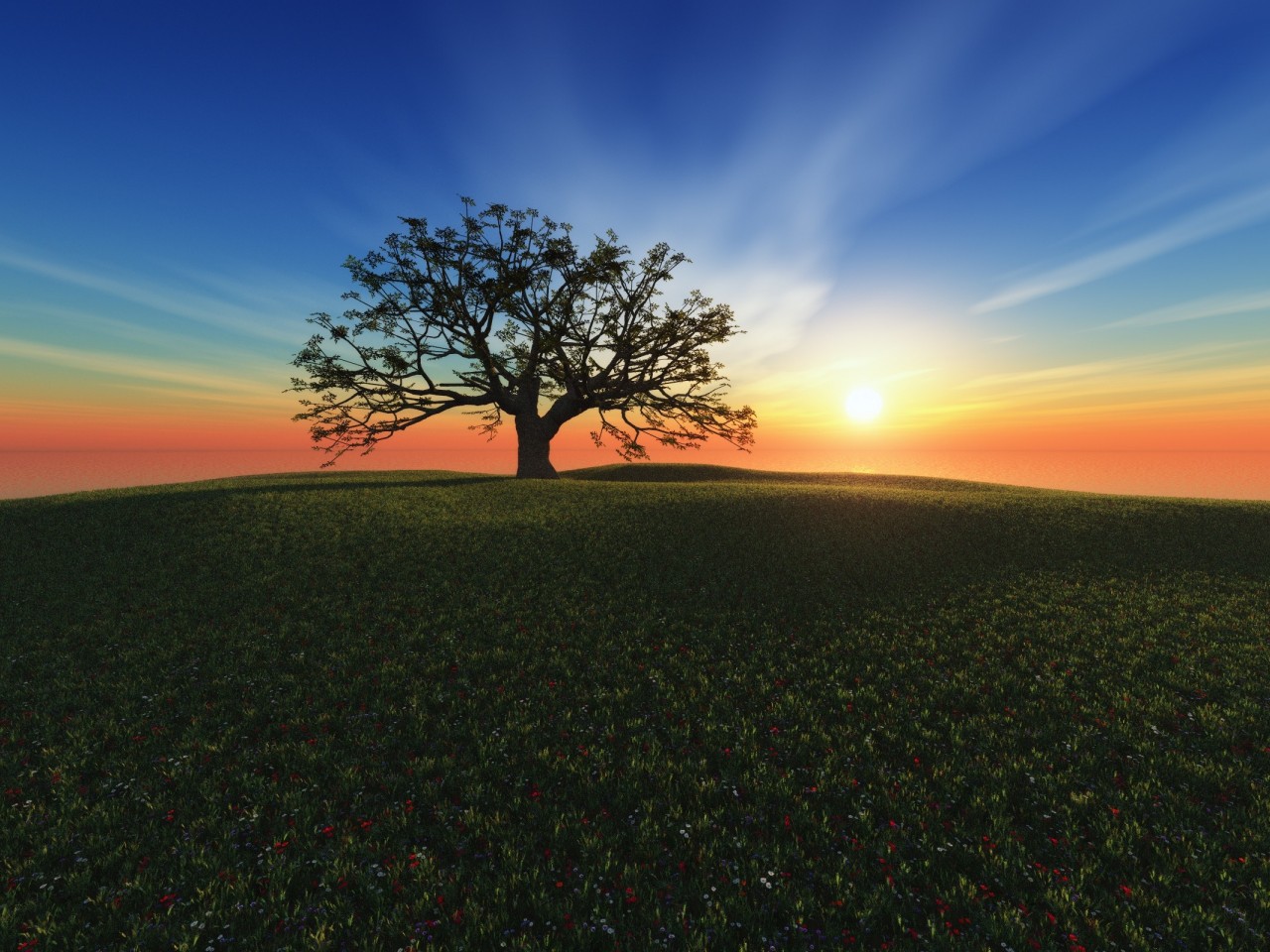 3D рисунок с цветочным полем одиноко стоящим деревом и закатом - 1280x960